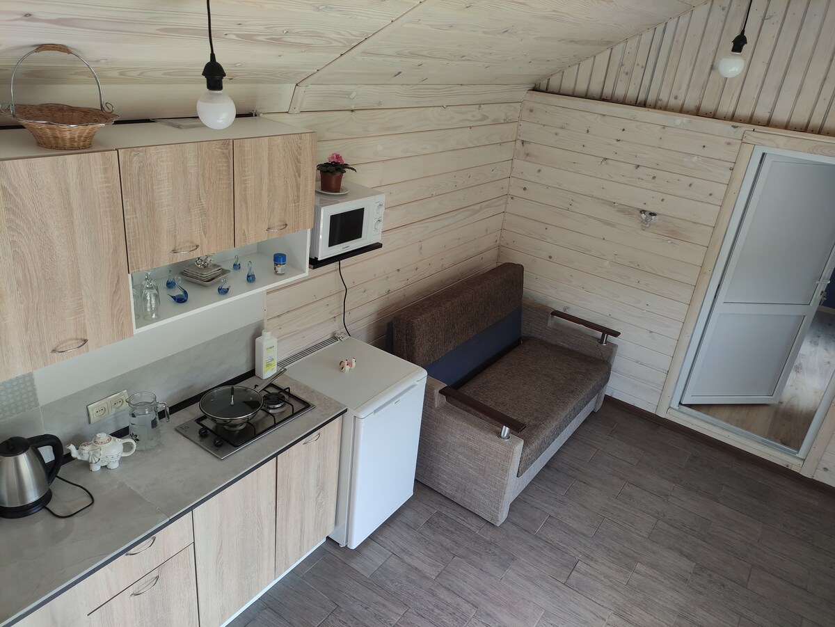 We invite you to relax in the author's room with panoramic windows, where everything is made with our own hands and with great love. This sunny room will be comfortable for both a couple in love and a couple with kids. The room has a separate bathroom, a cooking area and 3 beds. There is also a GENERATOR that we run in the event of a power outage to make your vacation as comfortable as possible in modern realities