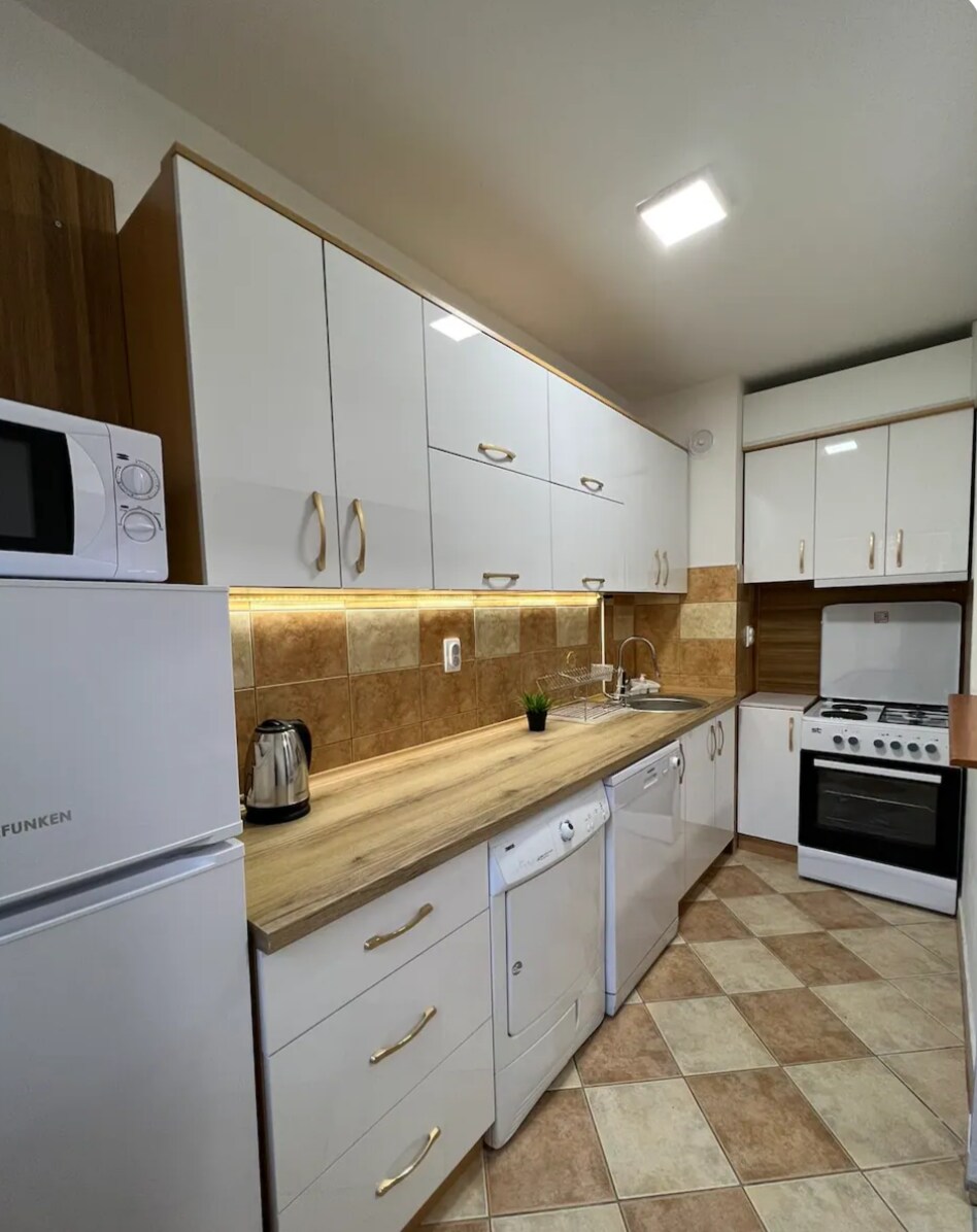 The apartment contains: 1. bathroom: -water heater -respirator -heater -towels -soap -shower gel -shampoo -slippers -toilet paper 2. kitchen: -hot water -refrigerator -mini oven -toaster -plates, spoons, forks, knives, glasses, pots and pans 3. living room/bedroom -air cooler -central heating -free super fast wi fi -a tv with over 50 channels (such as Arena Sport 1, tv 1000, Fox Life etc) -two single beds -a table -a wardrobe -an iron -a hair dryer -blankets and sheets