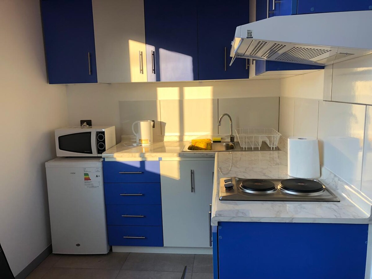 It's a small but cozy apartment, with a living room connected to the bedroom. The kitchen is separate and has all the necessary cooking utensils. The bathroom has a nice design and is very comfortable to use. The TV is in the living/dining room, and you can watch it from the bedroom. For the winter, the air conditioning works as a heater that blows hot air.