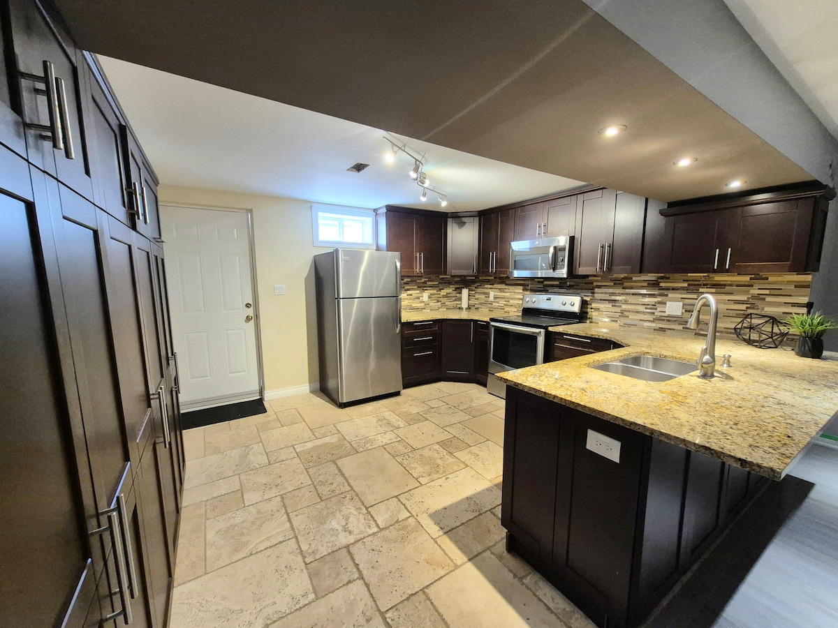 Legal Basement - This chic place comfortably accommodates up to 5 guests and comes fully furnished. There are 2 bedrooms, each accommodating 2 guests, along with a daybed in the living room for the 5th person. One bedroom offers a queen-size bed, while the other has a double-size bed. Also, there are 2 study tables with chairs, one in each bedroom and one in the living room. The meticulously designed kitchen boasts modern and luxurious touches. The stylish washroom features a standing shower.