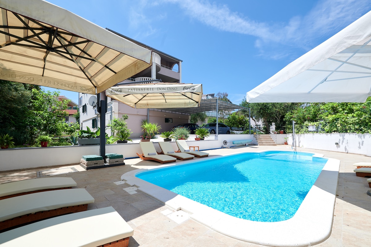 1BR/1BA, sleeps 3 | Infinity Pool, Terrace & Direct Beach Access Garden BBQ, Free Parking, Spacious Living & Dining Areas – Perfect for Families or Couples Luxury beachfront apartment in Villa Rosea on Ciovo, sleeps 3. 1BR/1BA, kitchen, spacious living & dining areas. Private terrace with sea view, infinity pool, garden BBQ, free parking, and direct beach access. Close to restaurants, shops, kids’ playground, bus station and ferry to Split – only 30 min by catamaran.