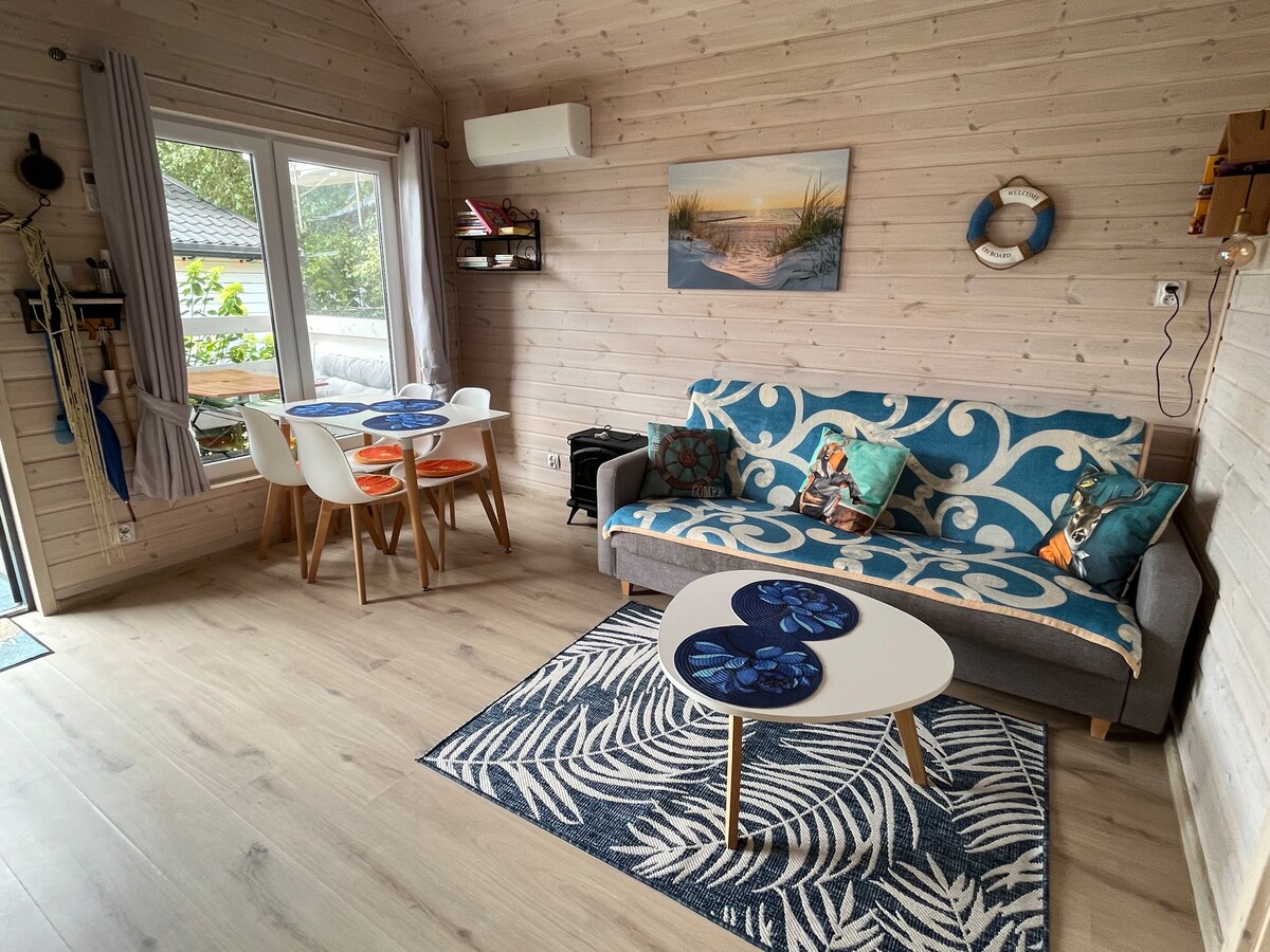 The 48[m2] cottage (including a 12[m2] terrace) has a living room with kitchenette, and two bedrooms. One of the bedrooms has a double bed and the other has a double bed. The kitchen is fully equipped, so there is no need to take your own things with you. The cottage is located on a monitored resort with a playground, a canopy with ping pong and table football and other toys for the little ones. The resort is located next to a forest and it is less than 400 metres to the beach via a forest path.