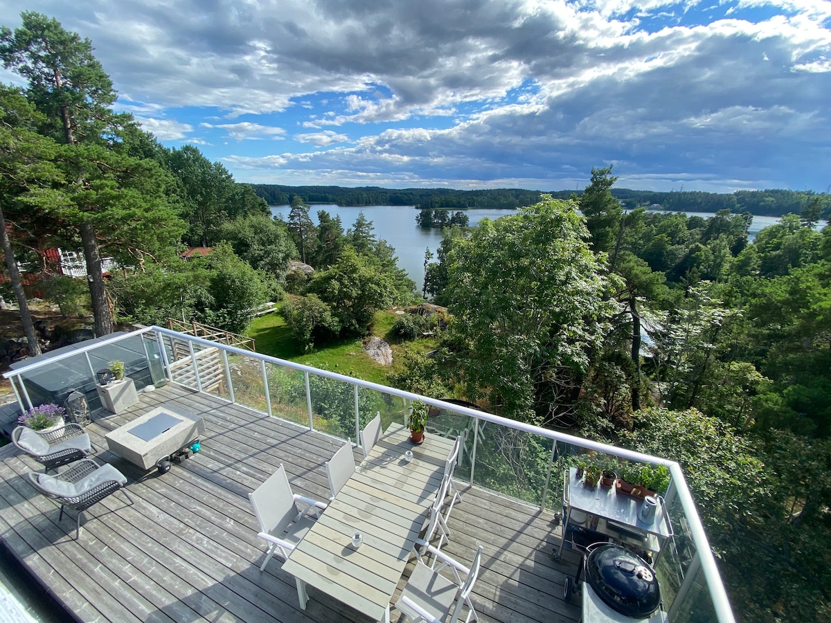 Featured in Airbnb Unique Stays - Three Cabins That Break the Mold Modern house with huge windows and balcony around the house. Great garden towards the forest. It feels like your in a treehouse when in the living room. - Sauna to rent in the garden. - 450 meters to the lake. - Climbing wall, trampoline and slackline in the backyard. - Great internet connection. Two bedrooms and a huge kitchen/living room with a fireplace. Perfect for 4-5 guests or a family who likes to cook, play and swim.