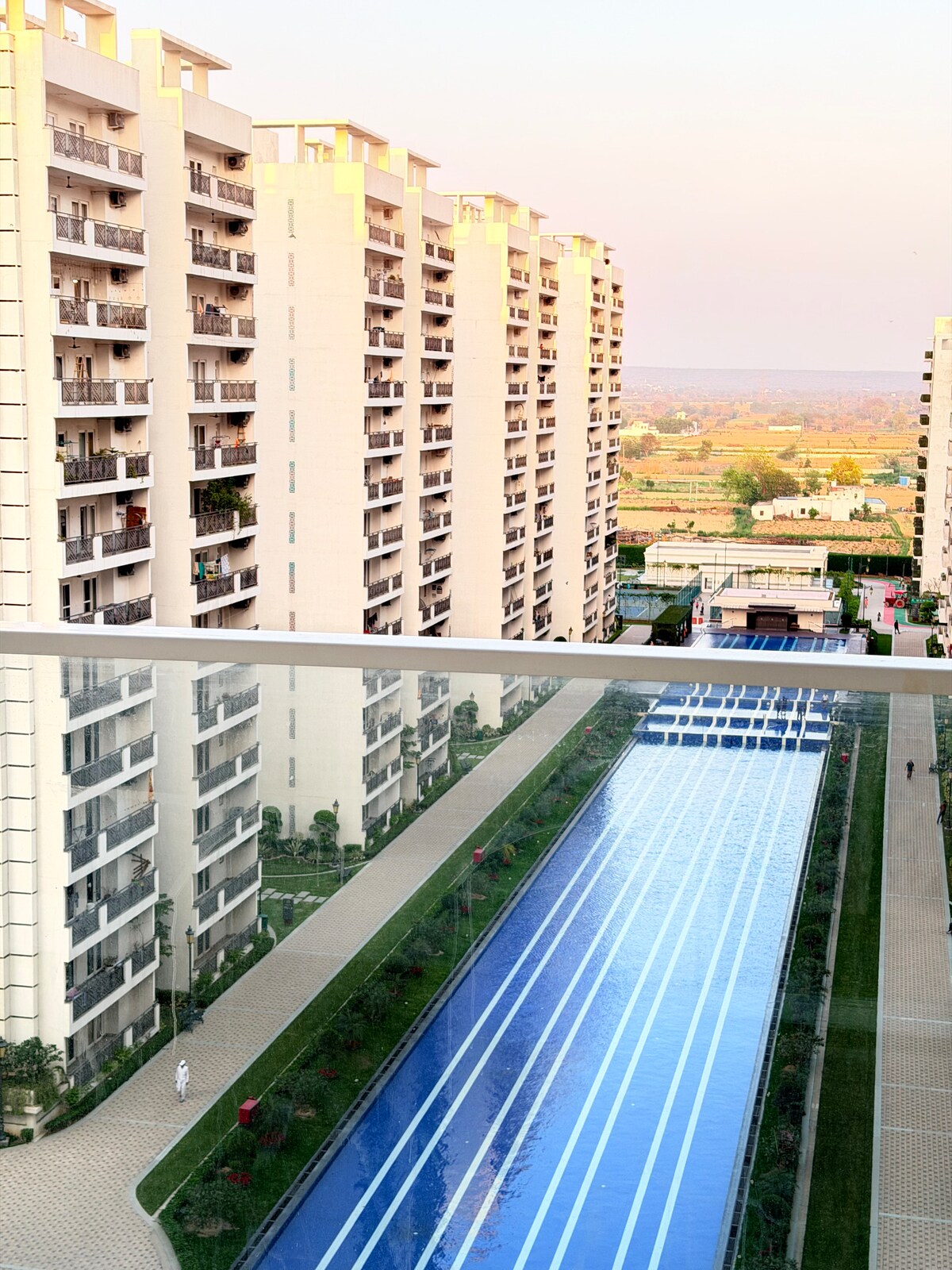 Modern 1BHK in Central Park Flower Valley. Sunlight fills the bedroom with a king bed and calm interiors. The balcony is a little wild, making it perfect for fresh air, chai, or a smoke under open sky. Kitchen is fully set for basic cooking. Smart TV, Wi-Fi , AC + inverter backup keep you comfortable. Great for business trips, short stays or slow weekends. A peaceful pocket of soft luxury in Gurugram. Soft daylight in every corner feels designed to breathe with a beautiful Aesthetic pool View.
