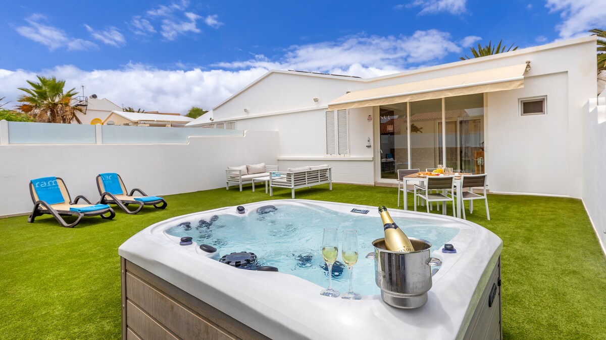 Der Bungalow hat 98 m² und wurde soeben aufwendig und sehr hochwertig renoviert. Er verfügt über 1 Schlafzimmer, 2 Bäder, ein großes Wohn-Esszimmer, eine Küche und sehr geschmackvoll ausgestattet. Eine große, uneinsehbare Innenterrasse mit großem Jacuzzi, Liegen und einem Sitz-Loungebereich laden Sie zum Verweilen ein. Im Wohn- und Schlafzimmer finden Sie jeweils einen Flachbildfernseher mit deutschen/internationalen Fernseh- und Radioprogrammen.