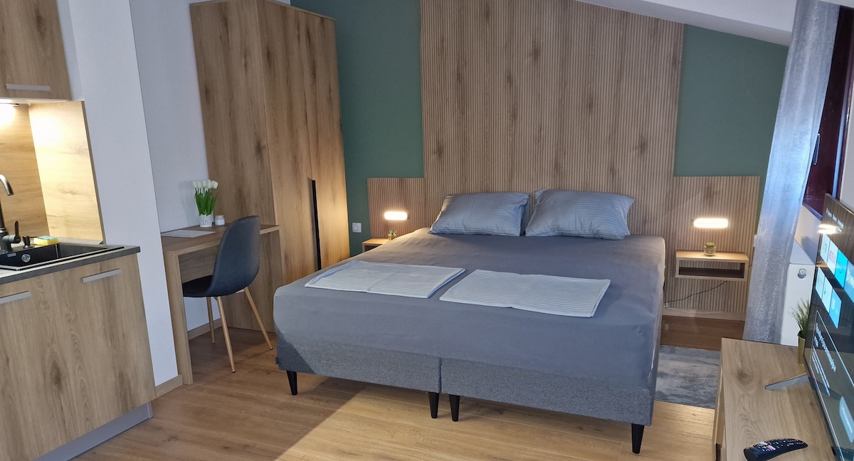 Welcome to NadaHome, a bright and spacious two-bedroom apartment surrounded by greenery in a small residential building. Enjoy free parking in the courtyard. Located less than 10 minutes from the city’s pedestrian zone and just minutes from the city hospital, the area is filled with charming historic buildings. The apartment features a fully equipped kitchen, a living room and a bedroom with a comfortable double bed and work desk. Stay connected with high-speed 400 Mbps fiber-optic internet.