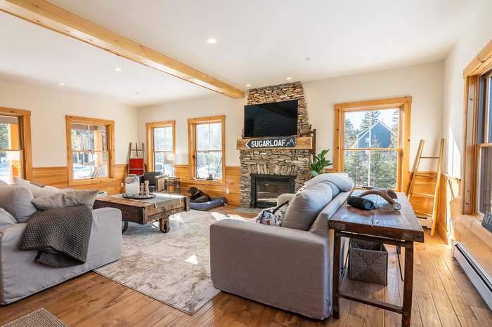 This lakefront vacation home combines rustic charm with modern comfort, making it one of the best options for Maine vacation rentals, Moosehead Lake cabin rentals, and lake cabins. Inside, enjoy stunning lake and mountain views while you relax by the wood-burning fireplace, perfect for cozy evenings in a winter vacation cabin, or whip up delicious meals in the fully equipped kitchen, or enjoy a short stroll to Moosehead Lake during a breathtaking summer sunset!