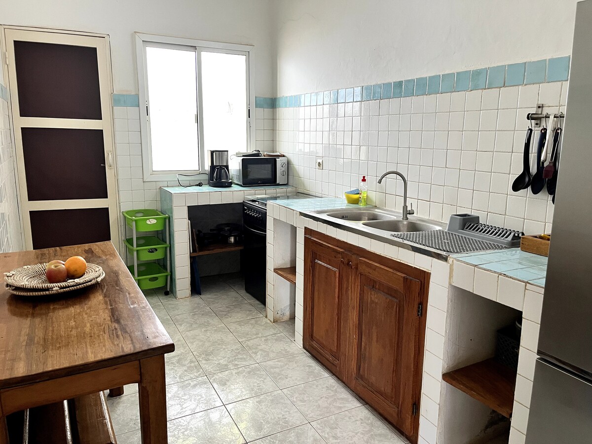 Woyofal electricity meter to be recharged by wave or orange money upon arrival This peaceful accommodation offers a relaxing stay for the whole family with its two bedrooms with double beds and two small children's bedrooms with bunk beds. The whole around the pool and facing the rest and dining area with its kitchen. All in a garden planted with banana, lemon, grapefruit, mandarin and date palms.