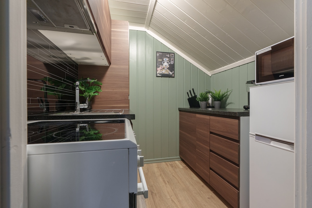 Practical, modern and cozy apartment with bedroom (double bed) and loft (2 single beds). Kitchen with everything you need for cooking and spacious seating. The mini house is located on a private property with green areas around. Parking is just outside the front door.