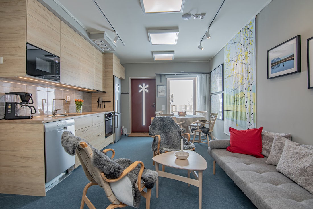 Here you can enjoy the tranquility with proximity to both magnificent mountains and beautiful lake views and hiking trails. When you look out the window, you will see the Artfjället nature reserve, with the possibility of a fantastic nature experience. In Umfors, there is a store and a gas and charging station. Here you have a 15-minute drive to Hemavan's lift system, shop and restaurants. From the cottage, you are also close to Norway. To Mo i Rana it is 75 kilometers.