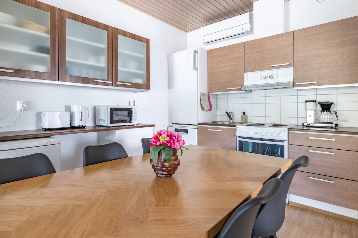 Bright, spacious, and pet-free fully equipped holiday apartment in the heart of Vuokatti, set in a peaceful pine forest with direct views of Vuokatti Hill. Close to ski slopes and cross-country tracks. A guest favorite, suitable for remote work and car-free travel. Cleaning included for bookings made after 18 Jan 2026. Two quiet bedrooms with blackout curtains. Excellent storage space. The nearest grocery store, restaurant, and EV charging station just a few hundred meters away.