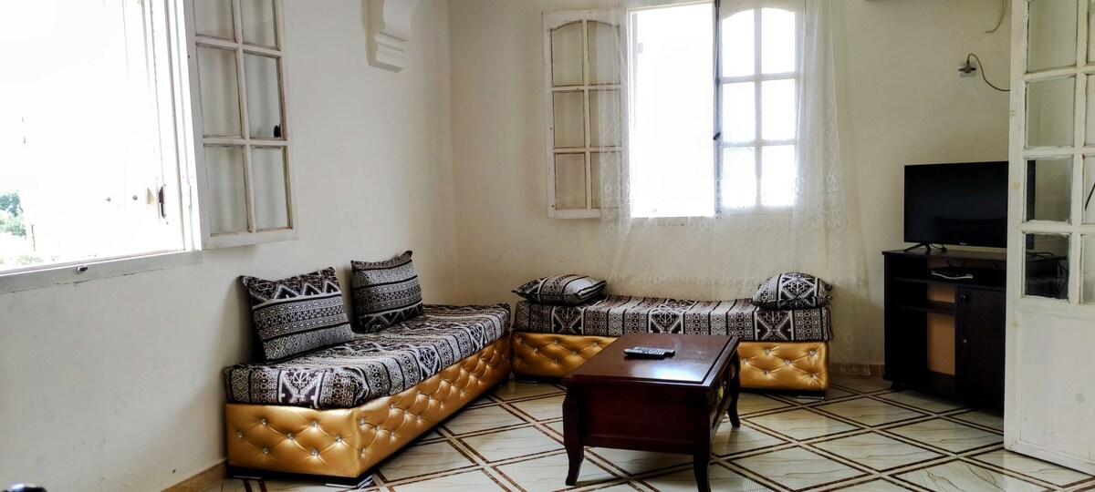 À Proximité Immédiate DE LA MER. Appartement situé à 50 m de la plage pour 8 personnes, avec balcon au 2e étage, loin du bruits et de la pollution, tranquillité et repos garantie en pleine nature. Idéal pour visiter l'antique Béjaia et ses plages. L'appartement se compose de deux pièces, soit une chambre pour couple ( lit à deux places) et une chambre d'invités 6 places ) très bien équipée (climatiseur, télévision , table ....) et une cuisine , Bien équipé., une salle de bain , WC, placard