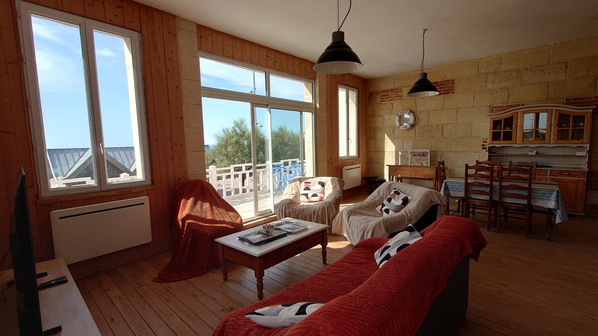 43 m2 duplex apartment with mezzanine. Large double bed on this one. Two single bunk beds in the entrance, as in ski resorts. Possibility of a mattress in the living room or in the mezzanine. Travel cot and high chair available (on request). Pleasant living room with large bay window, stunning views, full west, of the ocean. Bathroom with shower (in the bathtub) Kitchenette (Microwave & Electric Plates). Sheets & towels are provided.