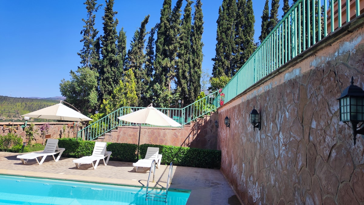 Beautiful residence composed of 5 beautiful apartments with swimming pool located on a small hill and the heights of a green region with a 360° view of the surroundings of the Atlas mountains covered with snow during the winter season, and the neighboring villages hidden between the olive trees and greenery. The residence offers its visitors wishing and looking for a cozy corner to unwind. It is ideally placed to offer a breathtaking view of the valley. Come and enjoy it :)