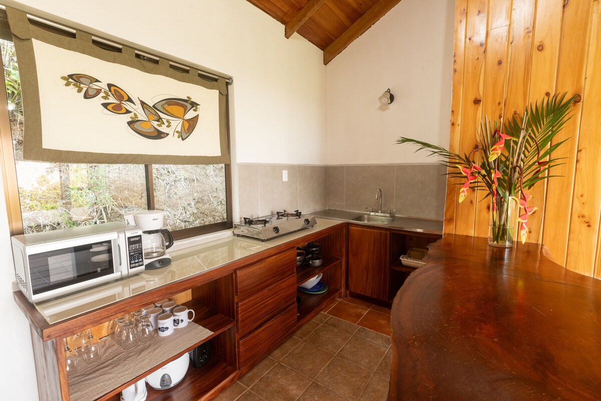 Si esta buscando un espacio cómodo, con una vista excepcional, justo al lado del bosque nuboso y múltiples espacio para compartir en familia o con amigos este es el lugar indicado. Esta cabaña te ofrece mas allá de un lugar donde quedarse una experiencia en una propiedad de mas de 14 ha, con senderos, áreas productivas y animales de finca. La cabaña se encuentra estratégicamente muy cerca de los principales atractivos de Monteverde.