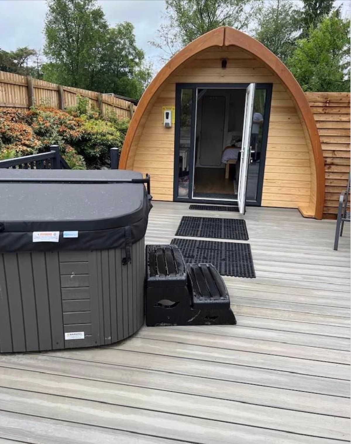 The Galloway Luxury Lodge Pod with 2 person electric hot tub is nestled amongst the Carrick Hills in South Ayrshire, South West Scotland. Features :- En-suite shower, sink and WC Fixed double bed Bed linen and towels (2 per person) Large sofa bed Kitchenette with fridge, microwave, kettle, toaster and sink Cutlery and crockery Dining table and chairs Flat screen TV/DVD Electric sockets with USB charging points Sub zero insulation and under floor heating so they will be warm and cosy