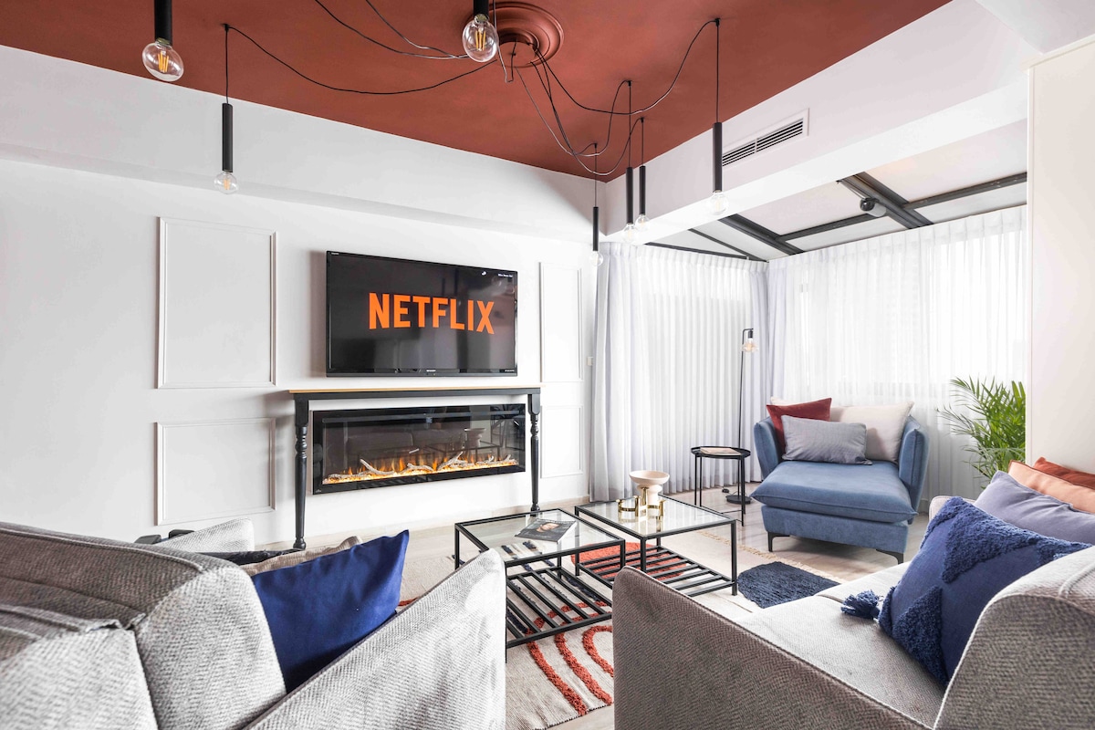 Wake up above the clouds. A penthouse of international standard offering a rare hosting experience. The huge living room is surrounded by huge windows, and you have two luxurious balconies for morning coffee or wine in front of the sunset. The bedroom is an architectural masterpiece with high ceilings and glass walls that simply bring the view into the bed. The perfect combination of luxury, tranquility and a winning central location.