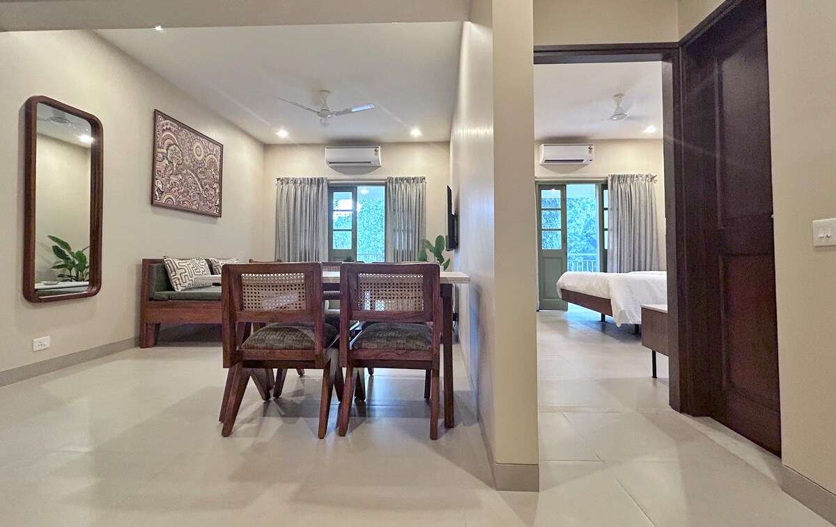 Our Signature Room is a design-forward space featuring a King bed, an open to sky bathroom, and a bathtub blending comfort with thoughtful aesthetics. The room is equipped with high-speed Wi-Fi, air conditioning, and a smart TV for a seamless stay. Located just 1.5 km from the beach and 900 meters from the local market, the property offers easy access while remaining a peaceful retreat. Our spaces are intentionally designed to foster community, creativity, and authentic travel experiences.