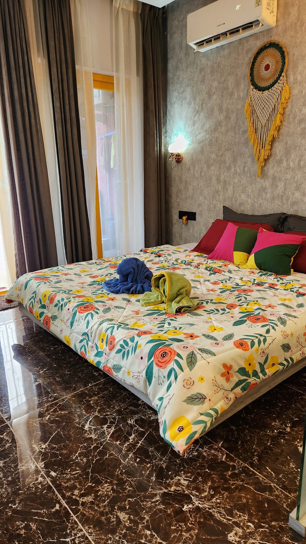 Welcome to your ultimate luxury escape in Siolim, Goa! Discover a spacious 1BHK that transports you to the magical world of Bali with its mesmerizing boho interiors. Enjoy the breathtaking mountain views from the balconies and the luxury community pool. With its gated community, necessary kitchenware, wifi, central location and peaceful surroundings, this flat offers everything you need for a comfortable and peaceful stay in the heart of North Goa. Check IG - aura_luxurystays for more details.