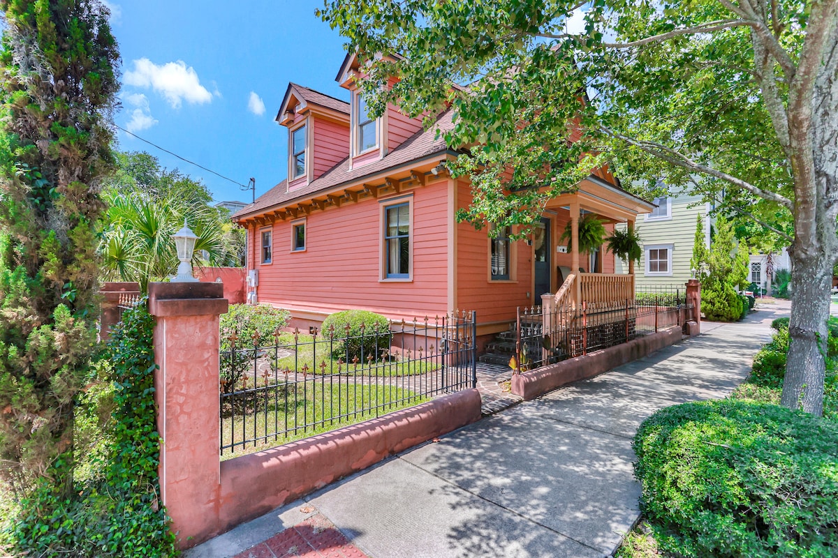 adorable and charming 2bd/2ba house only two blocks from forsyth park. lovely *victorian mansion meets cottage* home to complete your perfect savannah vacation. two extra large bedrooms each with en suite bathroom. one king bed and one full. twin rollout and fold out couch available for larger groups. quintessential front porch and perfect private fenced in yard with brick paved patio and private parking spot and free laundry.