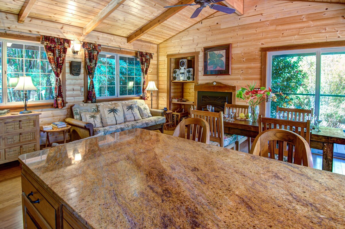 A beautiful get-away surrounded by nature on a cacao farm! One-bedroom + loft cabin, full kitchen, bathroom, w/d, sunny lanai, on our Big Island off-grid permaculture farm. Cabin is nestled in a food forest a few hundred feet from a stunning waterfall with swimming hole in a peaceful bamboo grove. One king-size bed in bedroom, two twin beds in loft, which has low ceiling & is accessed by steep narrow stairs. Free entrance to botanic garden. Organic eggs, homemade chocolate at farmstand!