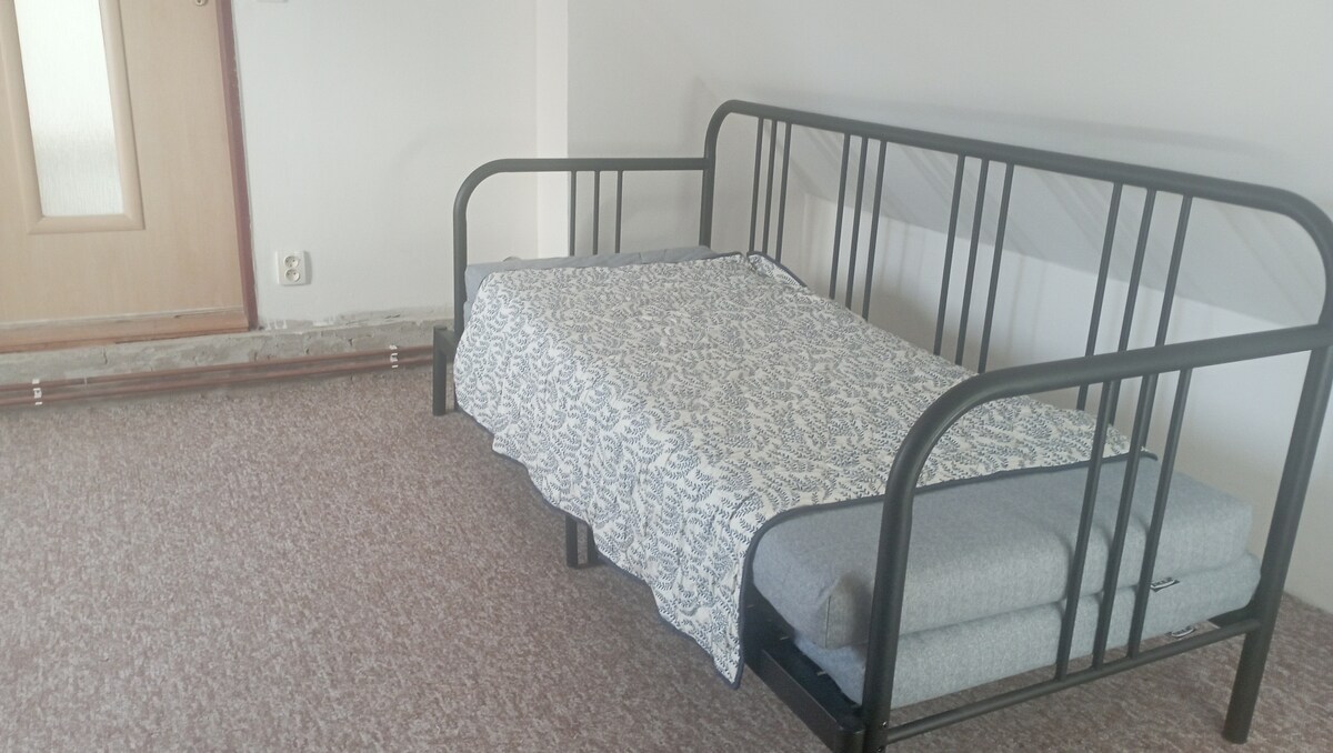 Sunny apartment in a quiet location minutes walk from the center. Free private parking in the courtyard. Available double bed in size 220x200cm, inflatable mattress for two, sofa for additional 2 people and fully equipped kitchen and living room. Prosluněný byt v klidné lokalitě Naše ubytování je skvělé pro delší dovolenou, jako alternativa pro práci z domova nebo pro rodiny.