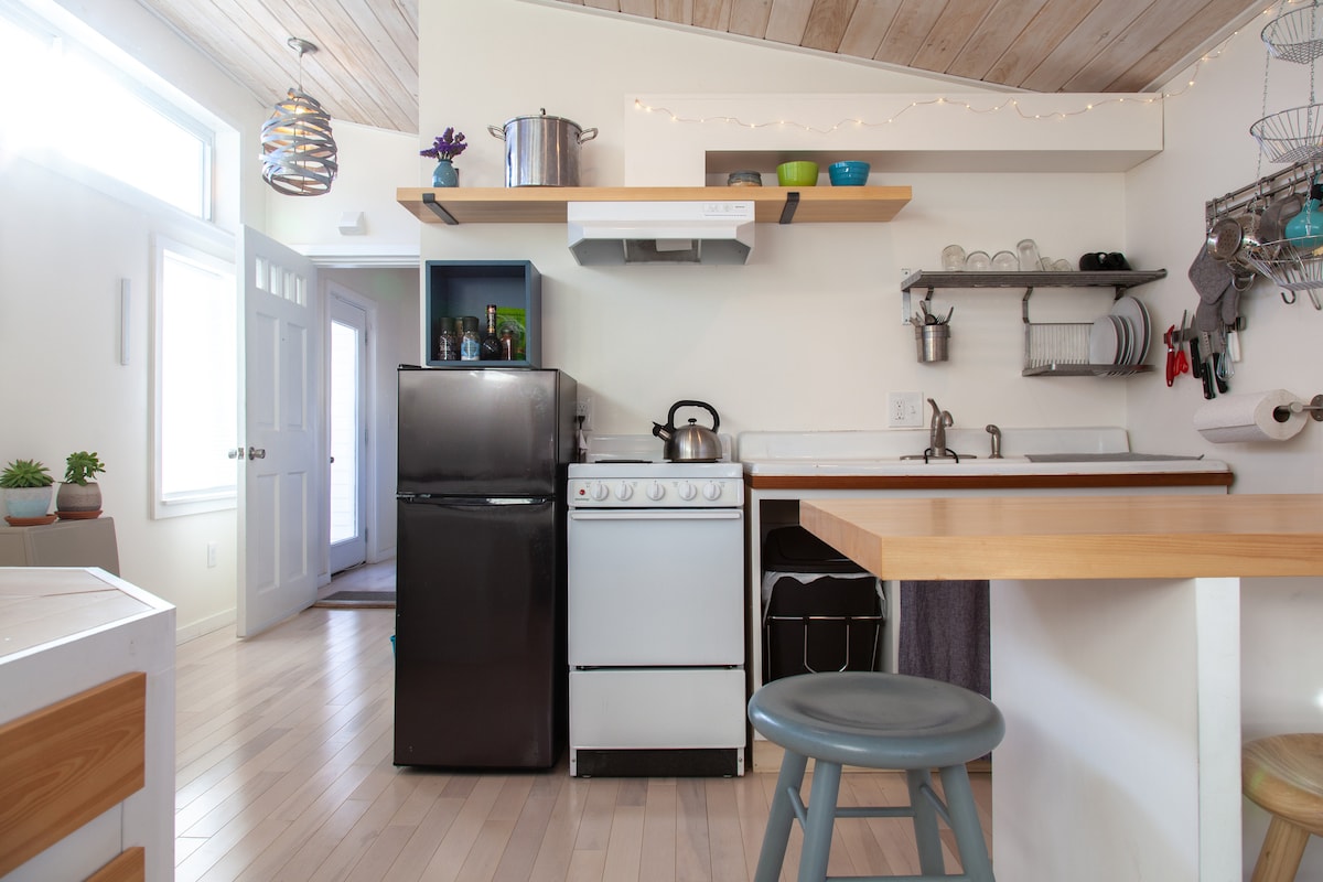 This bright guest studio is steps from the Greenbelt Walkway. Walk (within 10 mins) to two lighthouses, Willard beach, Bug Light Park, Scratch Bakery, Willard Scoops ice cream and a variety of restaurants. Portland is an 8 minute drive or 20 minute bike over the bridge. The space is minimal, bright and airy with windows surrounding, an elevated bed with comfy queen mattress, fully equipped kitchen, washer/dryer, and cozy couch for lounging.