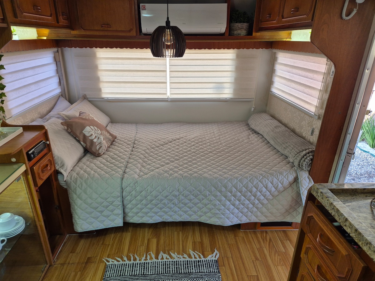 🌱 Stay in a fully equipped luxury trailer surrounded by nature! 🚐 ✅Comfortable double bed, sofa bed, air conditioning, TV, full kitchen with utensils, refrigerator, microwave and stove. Private bathroom with gas heating and towels included. 🔥Outdoor area with barbecue area, beach kit and space for a campfire. 🧺Bed linen, basic products and parking included. A cozy retreat, surrounded by trees and tranquility, ready for you to enjoy.