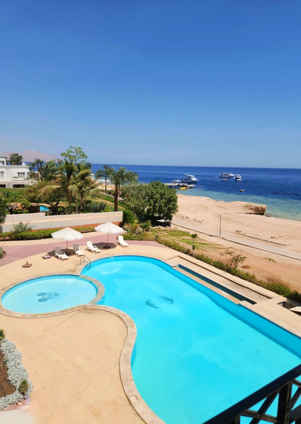 Beachfront villa with private pool and boat on Dahab beach; 3 sea-view bedrooms, panoramic rooftop terrace and exclusive private beach. Faris is set in a trendy yet peaceful part of Dahab-Assalah between the Neom Hotel and the popular Sarda Café/Restaurant (home delivery available). We also arrange private snorkeling trips by boat or excursions into the deep desert (1 trip is complimentary for stays of 7 nights or more). Cancellation: full refund or date change up to 2 months before check-in.