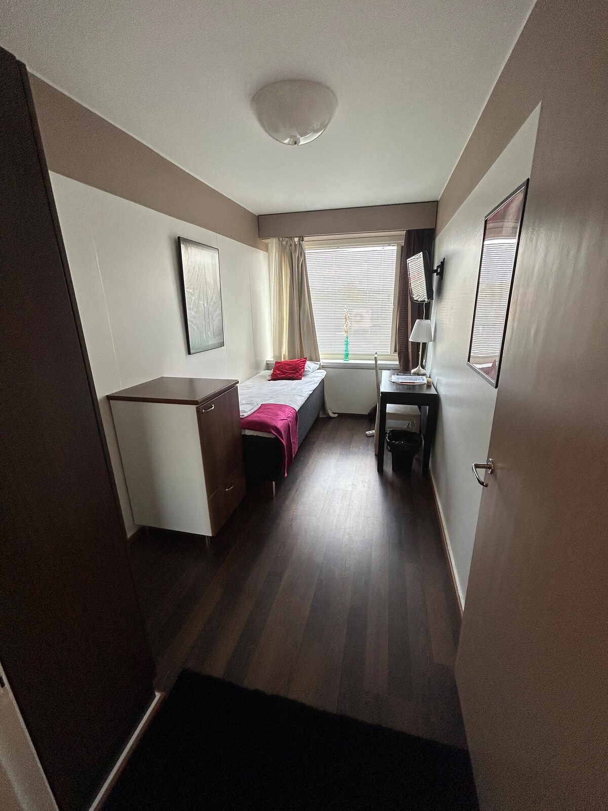 Winter offer free parking for hotel guests until end of March 2026. Homelike hotel room with great amenities at Hiisi Hotel Turku Seaport in Turku Harbour. The room featuring 2 single beds is suitable for up to 2 persons. Work desk and chair and an ensuite bathroom, a flat-screen tv and WiFi. All rooms feature a mini fridge. Linen, towels and final cleaning are included. No breakfast, reception or air-conditioning. Please note rooms are on the 2nd floor and the hotel has no elevator.