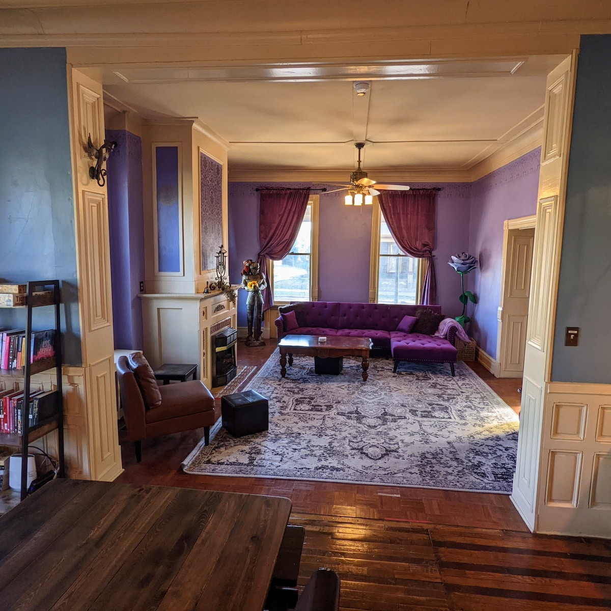 Luxuriate in the opulence of this historic Victorian mansion! This room is a comfy space with a large fluffy sofa. You will sleep in a spacious king-size bed. The desk will allow for remote-work for the busy traveler. The room also includes an attached, private bathroom with shower and clawfoot tub. The house is located directly across from the Riverfront Park and just minutes to Market Street. It is a short drive away from vineyards, antiquing, and hiking.