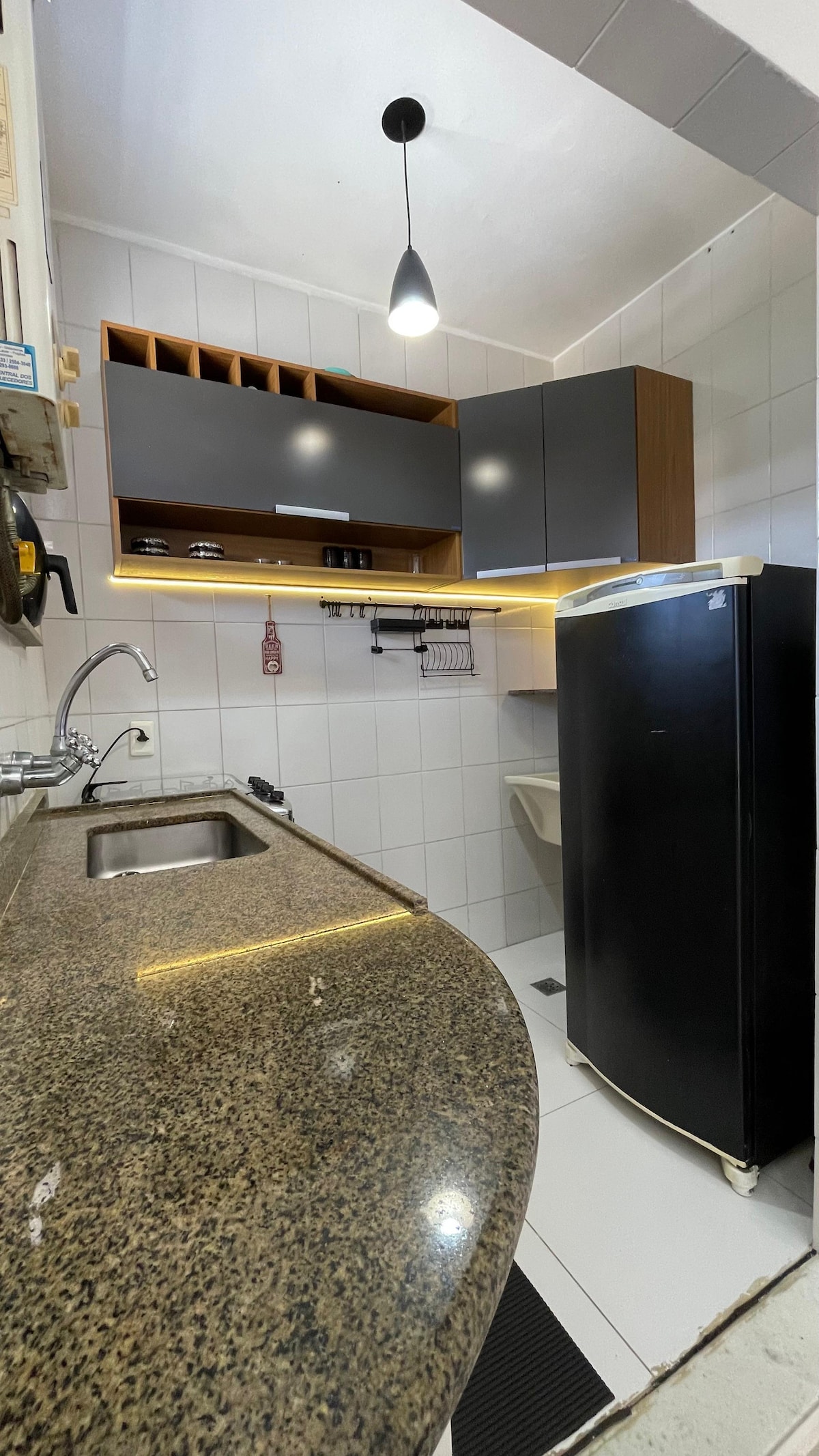 Beautiful suite, gourmet balcony, view of Barra da Tijuca beach, Pedra da Gávea and Canal da Barra. Small balcony with dishwasher countertop, equipped for quick and practical meals with microwave, air-fryer, sandwich maker, coffee maker, toaster, minibar, cutlery, plates, glasses and small microwave pots. ATTENTION: THERE IS NO STOVE OR POTS. Comfortable room with table and 2 chairs, double bed, closet and air conditioning. Bathroom with hot and cold water shower.