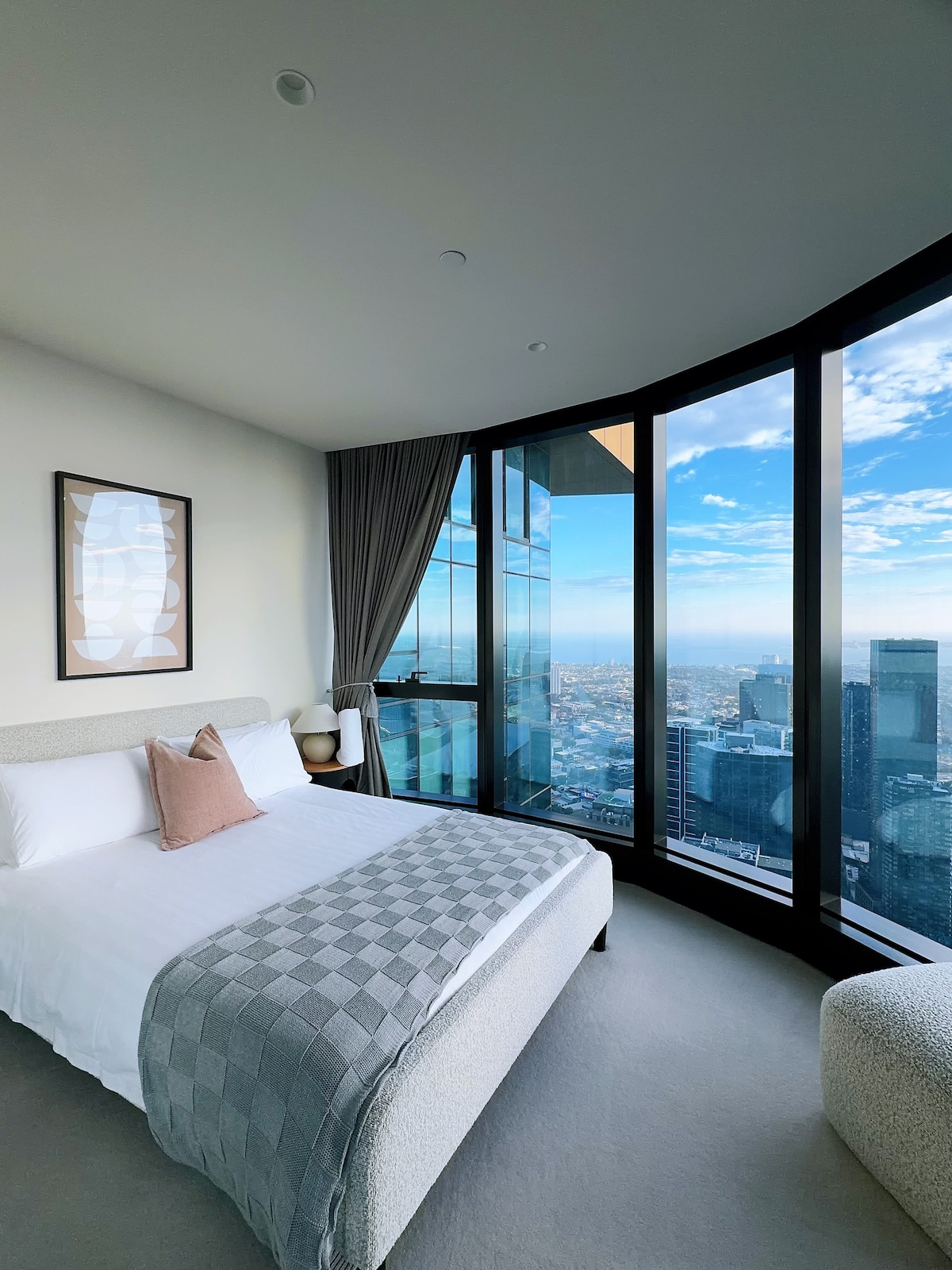 Welcome to Sky High International at Queens Place, where you’ll stay in one of Melbourne’s highest service apartments—perched on the 70th floor and above. Offering breathtaking 270° panoramic views of the city skyline, this luxurious 3-bedroom apartment sets a new benchmark for high-rise living in the heart of Melbourne CBD. Located within the Free Tram Zone, and with a Woolworths supermarket right downstairs, you’re just steps away from Queen Victoria Market, Melbourne Central, restaurants