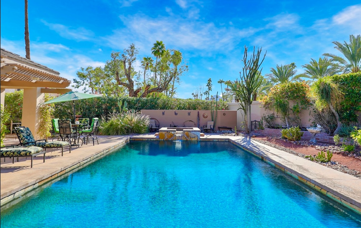 Large Master Bedroom & Sitting Room suite, 700 Sq.Ft, excellent location close to the exclusive shopping and restaurant district of El Paseo. Laundry room access on request. Secure Parking. Private setting with gorgeous views. Large patio areas by pool for Guest use. Jacuzzi heated on request. Wet Bar area with Sink, Hot & Cold water Fridge, microwave, kettle, coffee machine, etc. Home - Main House - occupied by owner couple only. Ideal for couple, additional child OK. Rear Patio with BBQ.