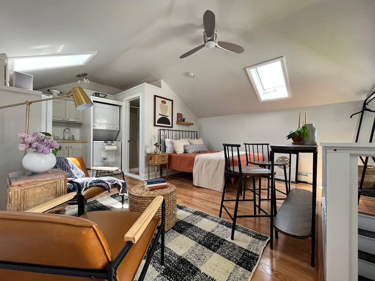 A lofted bed space with additional optional pull out couch fitted with ergonomic foam mattresses. This space has air conditioning as well as heat and amazing natural light. Brand new bathroom with rain shower head! A full kitchen with mini fridge, separate freezer space, oven, stove and coffee/tea supplies. Centrally located in Brunswick, and quiet! Right across from Bowdoin’s Whittier Field, and 10 minute walk to Maine Street.