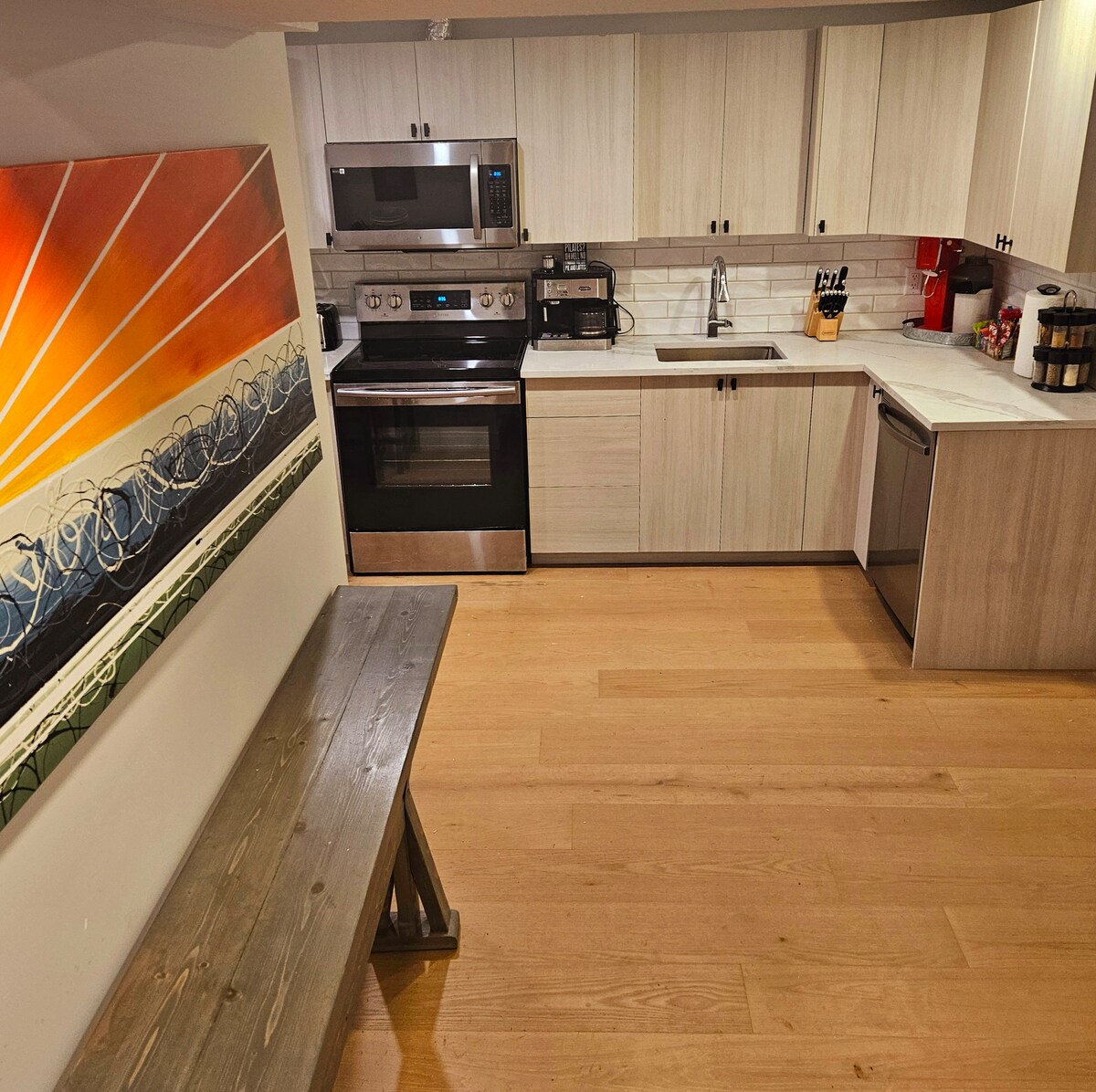 This modern 1-bedroom unit offers a private entrance, full kitchen, in-suite laundry, a new queen bed, and sofa bed. Enjoy early and self-check-in, high-speed Wi-Fi, cable TV, streaming on Netflix, Disney and Prime Video. Includes street parking & a private patio. Conveniently located near South Health Campus, Seton shops, YMCA, Cineplex. Whether you're headed downtown, visiting Spruce Meadows (10 min away), or planning a day trip to the mountains, this is the perfect base for your Calgary stay.