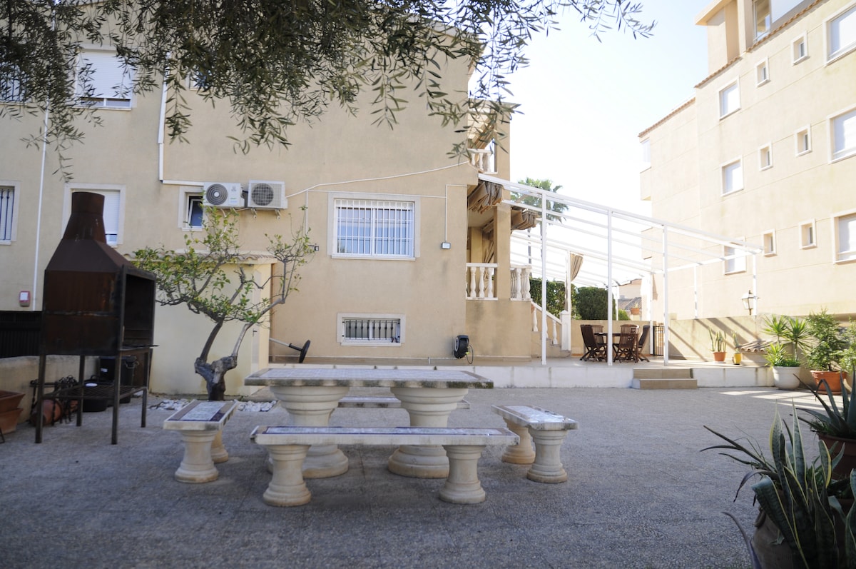🌊 Enjoy this cosy bungalow right on Tamarit Beach (Santa Pola), perfect for families or seaside getaways. It has 3 bedrooms, 3 bathrooms and can accommodate 5 people. A highlight is the spacious private patio, which is perfect for al fresco dining. It offers Wi-Fi, air conditioning and free outdoor parking. Quiet location, just a short walk from the beach and close to restaurants and amenities.🌟🏖️🌊