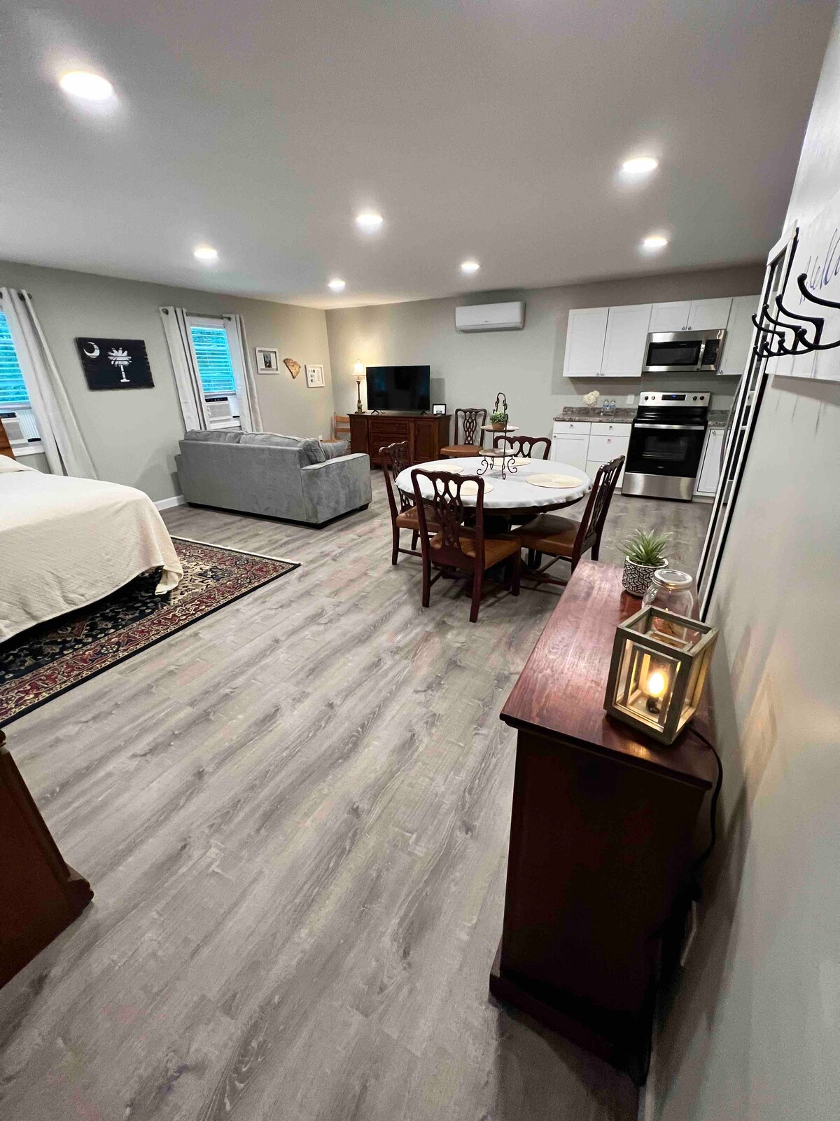 This fully renovated, king-bed guesthouse offers a peaceful, airy stay perfect for parents of college students, couples on a getaway, business travelers, and more. You'll enjoy a full kitchen, stocked coffee bar, spacious bathroom, and stylish living room with RokuTV. Parking is onsite with a private driveway and entrance. This puts you 10-15 minutes from downtown Spartanburg, including Converse, Wofford, and Spartanburg Methodist Colleges, and 20 minutes from USC Upstate.