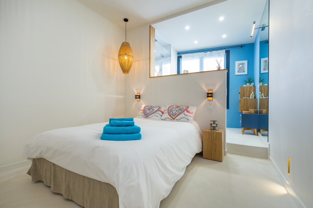 Stunning unit with 2 bedrooms and 1 bathroom (and a separate toilet) with direct view on the sea, the beach and the mountain. With all modern amenities (AC, WIFI, APPLE TV....) and beautiful decoration, this property has everything: a well equipped kitchen (washing machine and separate dryer), large sitting-room, great dining-room. Linen and towels are provided with sample cosmetic items. Located in the heart of old Antibes, it is close to the train station, buse and the provencal market!
