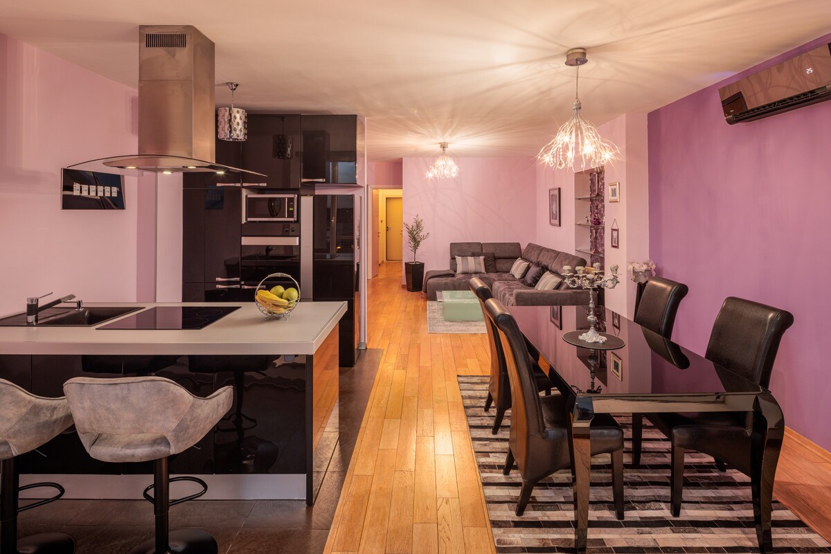 Immerse yourself in the tranquil ambiance of tastefully designed eclectic duplex. Throughout the flat, discover a harmonious mix of contrasting textures and patterns, accentuated by vibrant splashes of color and elegant French glass doors leading to the outside. After exploring the lively inner city of Split, unwind on the sundeck terrace with refreshing drinks. Experience the best of both worlds: the comfort and convenience of a hotel coupled with the privacy and coziness of a home.