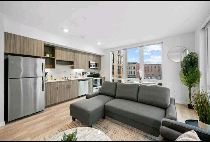 Discover urban luxury in this industrial-chic apartment. Secure gated parking for 1 car, elevator access, and a gym just steps away. Relax on the private balcony with view of the train bridge, or enjoy stylish interiors. Two spacious bedrooms feature walk-in closets, offering comfort and convenience. Sleep soundly on king and queen beds plus a queen pull-out sofa featuring a 4” memory foam mattress. Laundry facilities are located in-unit. Brewery and restaurant right out the front door