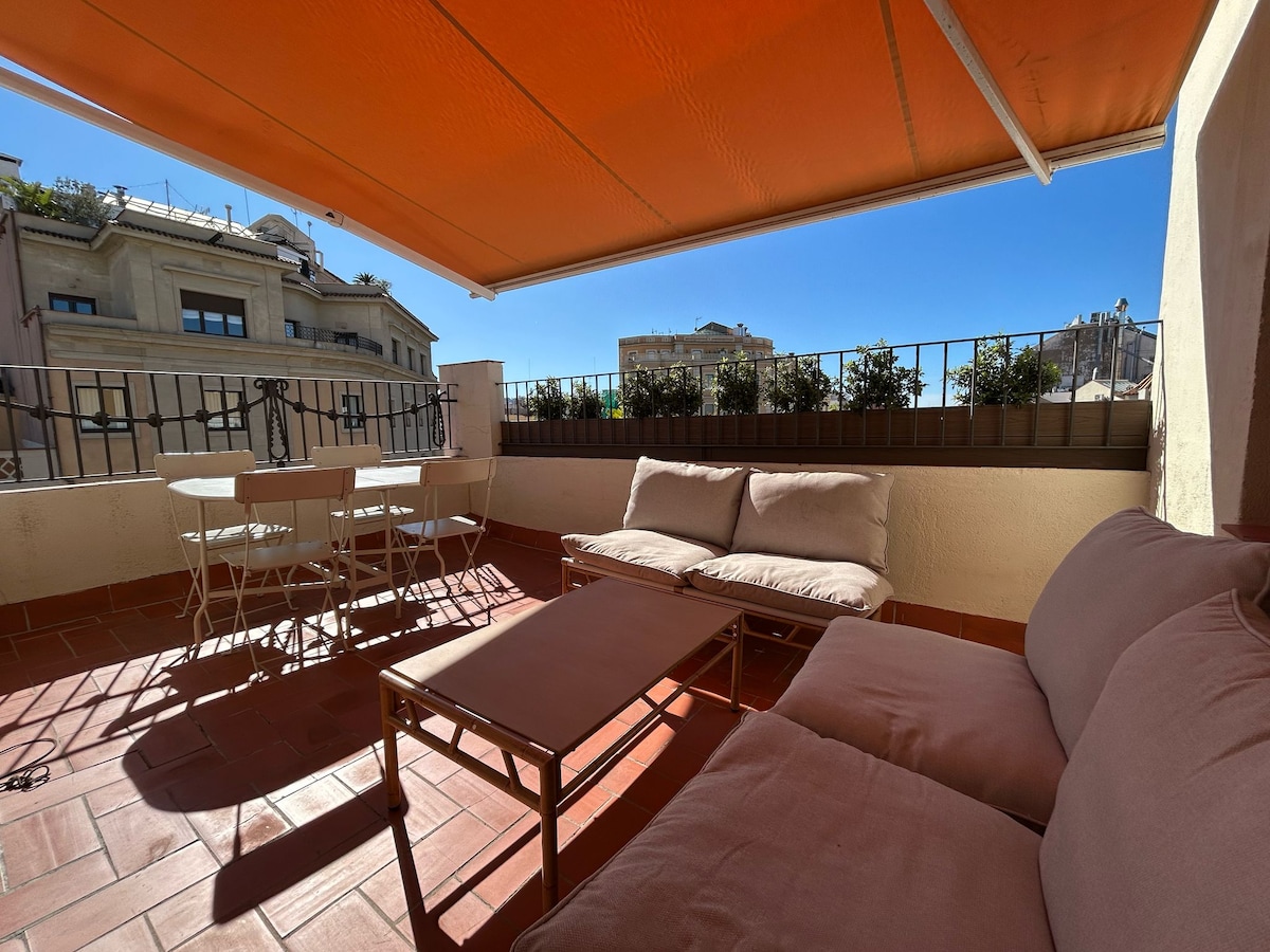 Sunny penthouse, all exterior, with an entranceway-dressing room, double bedroom, full bathroom with bathtub, separate kitchen, and a cozy living room with three steps that lead to a private terrace with shower. Two minutes from the metro, good communication with the airport and Sants station, surrounded by some of the best restaurants in the city and all kinds of services. The Sant Antoni market neighborhood is a quiet area, very well connected and in 15 minutes you can walk to Plaza Cataluña. Ideal for couples who want to enjoy the city. Don't miss out!