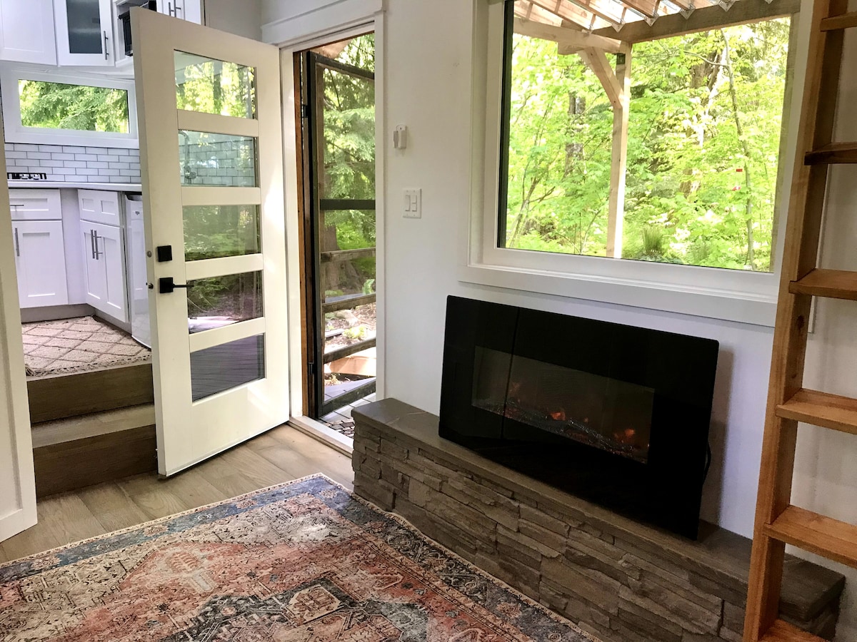 A nature retreat, where you can soak beneath the stars in PRIVATE HOT TUB year-round…sun, rain, or snow! A covered deck with cozy furniture. Wrap up in a blanket and sit by the propane fire table, sipping from gold rimmed glasses. Fully stocked kitchen! Wander mossy riverside trail where you won’t see anyone. Beautiful tiny home, wooden swings hang by thick hemp rope at your own outdoor breakfast bar. Hike to a lake from here, go fishing, ski Whistler. Drift off to sleep in luxury linens.