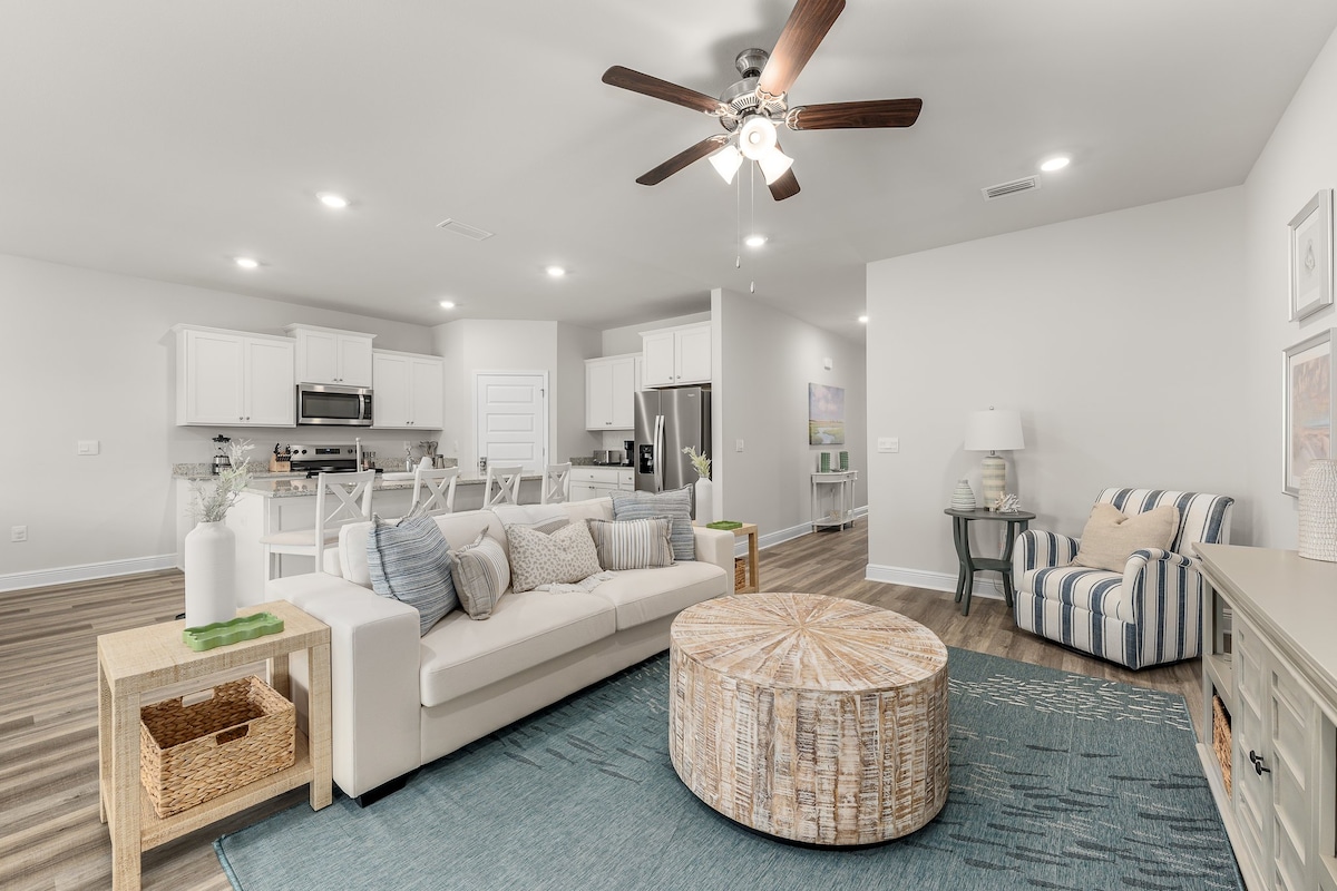 Welcome to "Gone Coastal" Enjoy all that Windmark Beach has to offer with a relaxing stay in this newer home is a 4 bedroom, 2 bath home that is one of the closest homes to the town center and main pool. It is 2 blocks from the beach, a easy 5 min walk or short bike ride to the beautiful white sand of the Gulf coast. This home features all the amenities such as bikes (including two ELECTRIC bikes), 2 paddle boards, and a 6-seater golf cart all included!