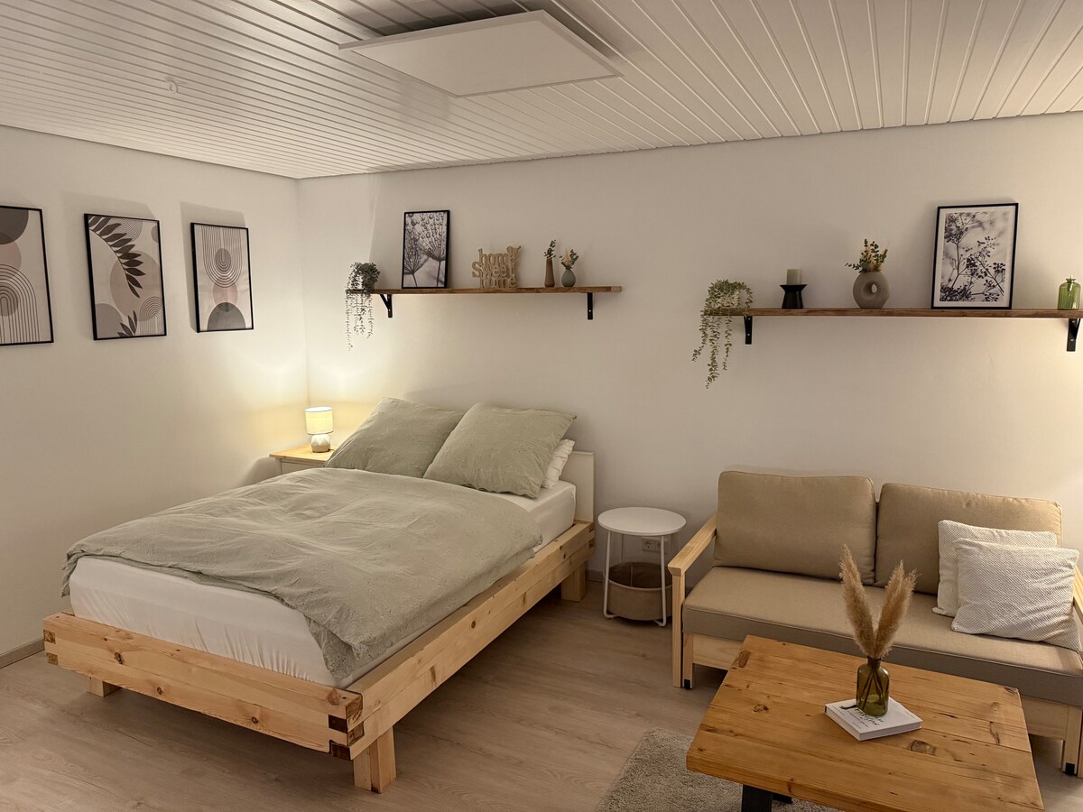Welcome to Airbnb on the outskirts of Mainz! The 21 sqm apartment near fields, forest and meadow is ideal for individuals or couples. There is an open space equipped with a bed for two, a wardrobe and a dining table (without a kitchen); also a bathroom that offers everything needed. You can work here (Wi-Fi available) or spend your free time. Parking is free of charge and check-in is flexible after 4 pm. Enjoy your stay ☺️