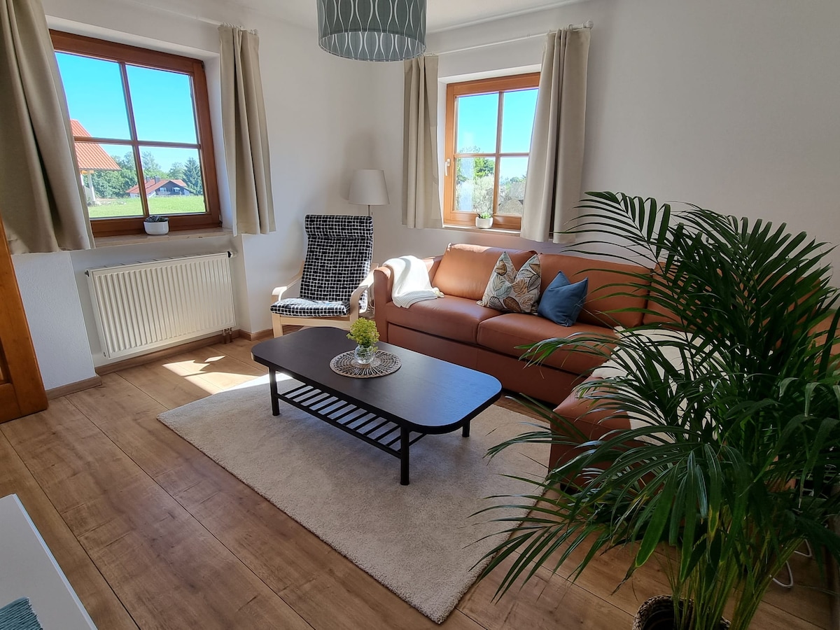 70 sqm apartment with 2 single beds, also to slide together. Sofa in the same room. Cot possible. Suitable for a couple with 1-2 children. Nice bathroom with shower. Small tea kitchen with fridge, kettle, sink and two electr. Stovetops. Parking lot at the house. Child-friendly, in summer barbecue facilities,extensive park to enjoy nature, 10 minutes on foot to the lake. View of the mountains and the Murnauer Moos.