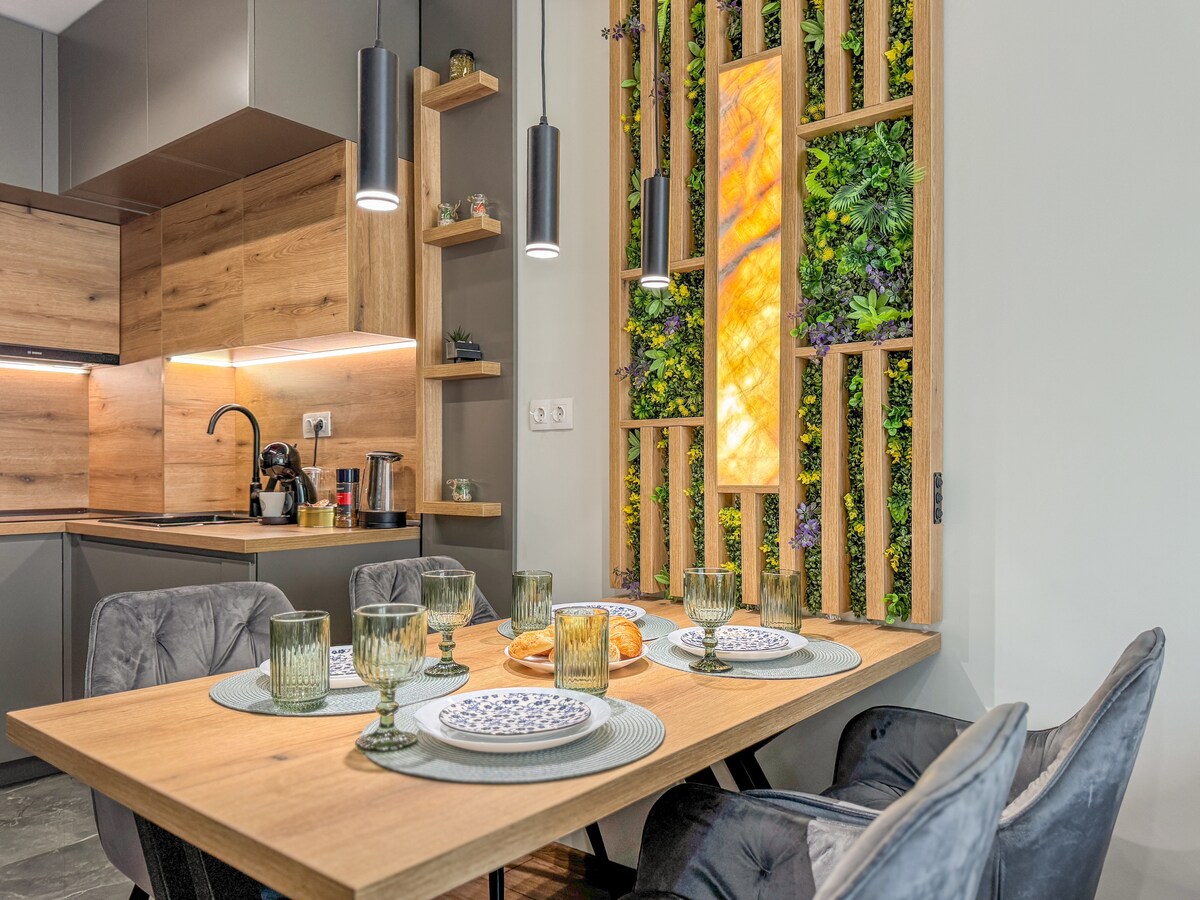 The modern living space features a stylish open-plan layout with a comfortable sofa and a flat-screen TV mounted on a feature wall. A central dining table is complemented by an elegant kitchen island, while large windows offer ample natural light.