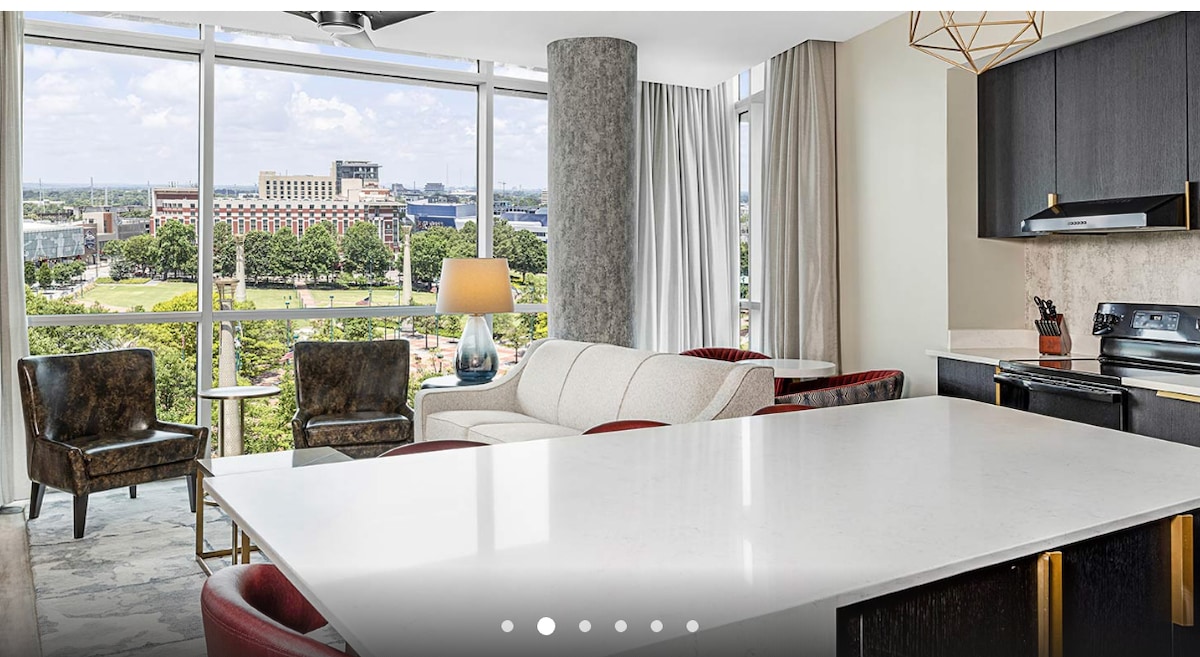 One‑bedroom Presidential overlooking Centennial Olympic Park — upscale, spacious accommodations for couples or small families. Walk to the SkyView Ferris wheel, museums, and the Georgia Aquarium, and unwind at the rooftop pool and bar. Features private master bedroom, generous living and dining area, full gourmet kitchen, full bath, private balcony, in‑unit laundry, high‑speed Wi‑Fi, climate control, work space, in‑room safe, and concierge services.