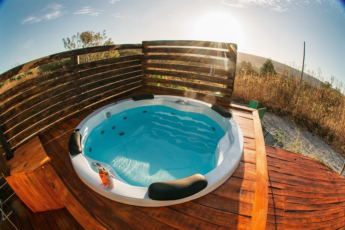Our Chalet is fully integrated with nature. It has large glass frames and the free view of the Cerrado and mountains providing a spectacular view. Full kitchen, top-notch bedding and bath linen, great heated shower, closet and bed with 5-star hotel mattress. There is a balcony with a deck along the entire length of the chalet, with a table and chairs, an outdoor environment for guests to contemplate the nature and the starry sky of Chapada - while having a wine in the jacuzzi!