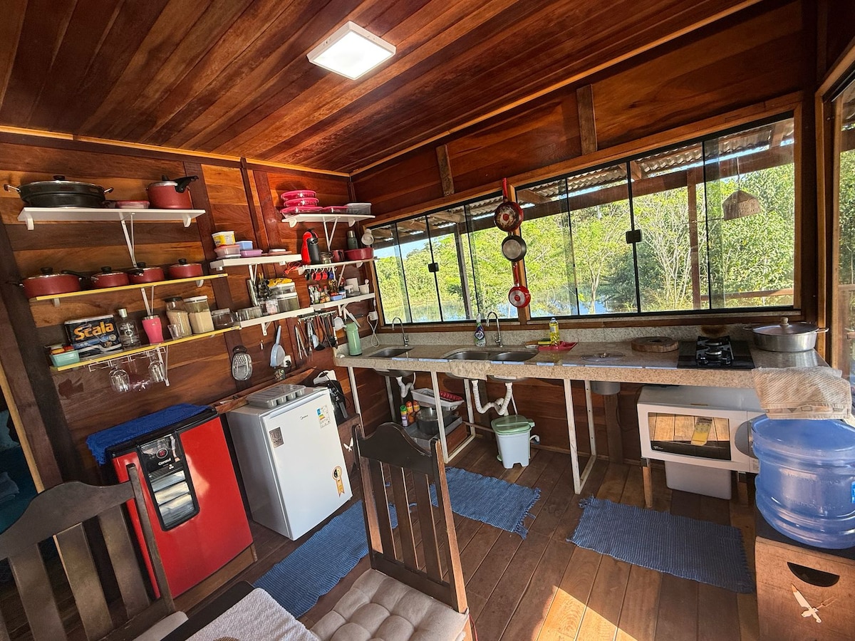 The chalet is in the middle of the Chapada nature, perfect for relaxing. It was built with affection and attention to detail. Accommodates up to 4 people: one bedroom with a double bed and two single beds. The kitchen is well equipped (fridge with freezer, stove, utensils). Bed linens and towels are provided to make you feel at home. It is 5 km from downtown Chapada, with good restaurants, bars, markets and pharmacies... A place to rest, listen to the birds and experience Chapada in a special way.